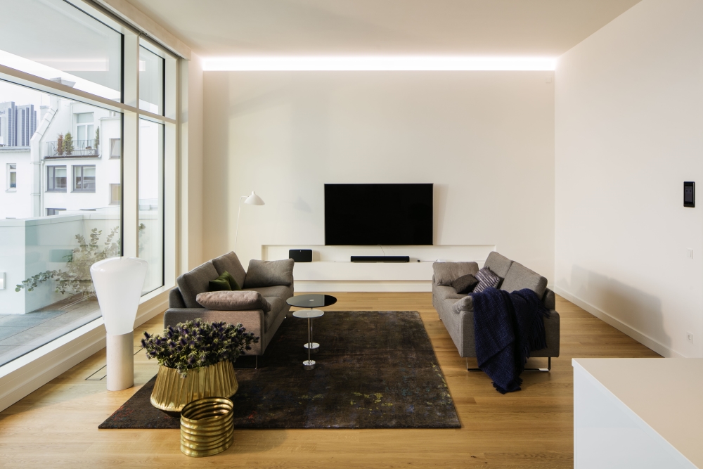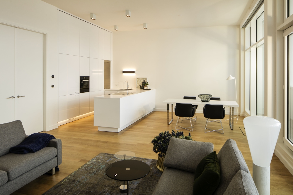 Großzügiger Wohn-, Ess- und Kochbereich mit Kamin | Küche mit weißen Einbauten und technischen Geräten der Marke Miele | Modernes Voll- und Duschbad: Dornbracht Armaturen und Spiegelheizung | Helles Eichenparkett | Zwei Balkone | Lebensqualität per Swipe - Beleuchtung, Raumtemperatur und Lüftung über Apps steuerbar