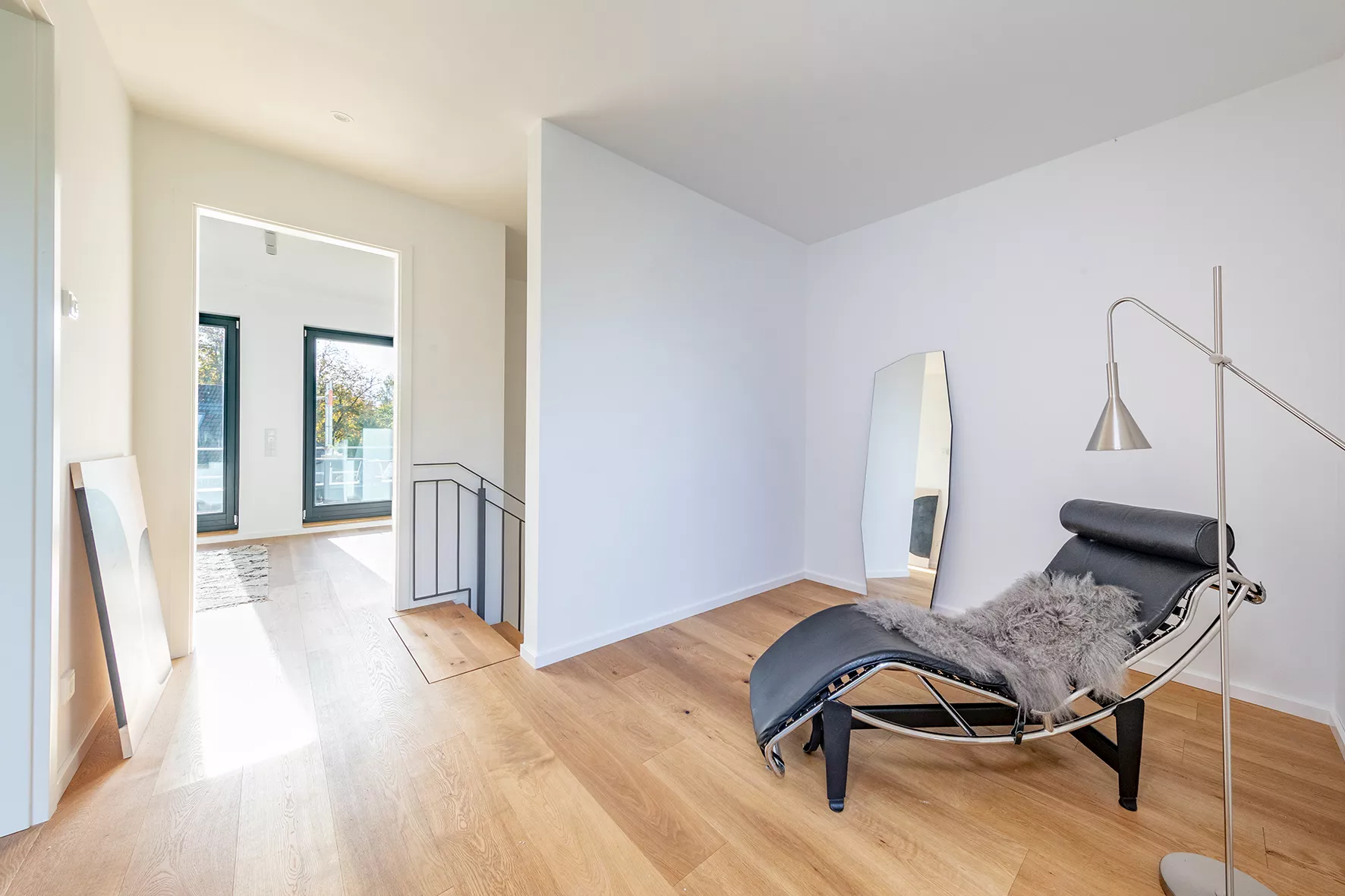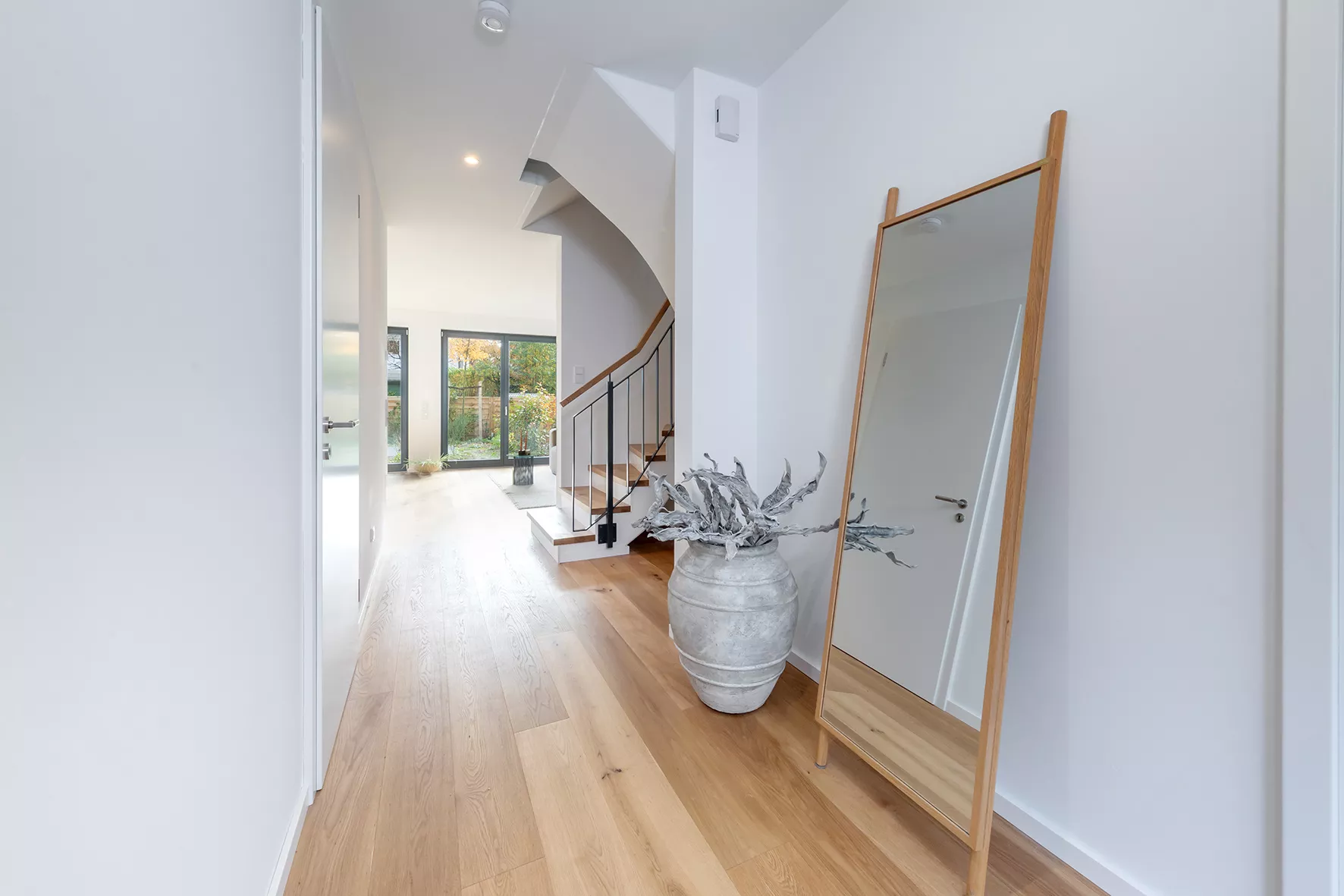 Zeitlose Eleganz: geputzte Wände mit hellem Anstrich, Eichenparkett in Dielenverlegung, großformatige Feinsteinzeug-Fliesen in den Bädern, Fußbodenheizung, offene Wohn-, Ess- und Kochbereiche, die Bäder mit hochwertigen Armaturen der namhaften Hersteller Villeroy & Boch und Grohe. Die Terrassen und Gärten sind nach Süden und Osten ausgerichtet sowie mit einem Bodenbelag aus WPC-Dielen in Bangkirai-Optik versehen.