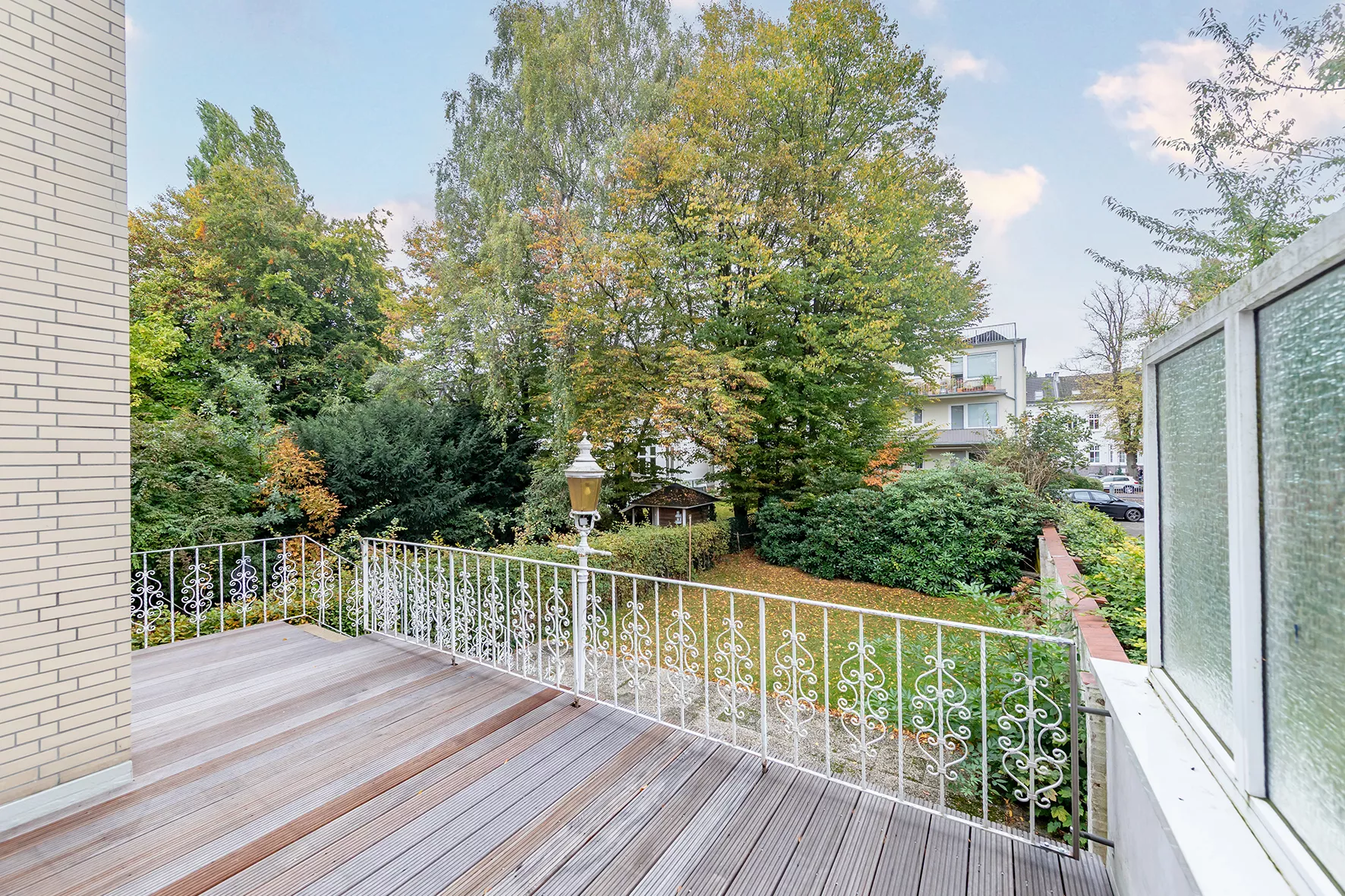 Hohe Decken im gesamten Haus | Stuckrosetten | Kassettierte Holztüren mit antiken Messingbeschlägen | Hamburger Fußleisten | Zwei Terrassen und zwei Balkone | Südgarten