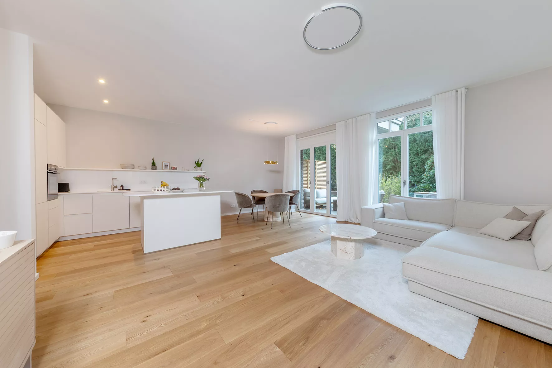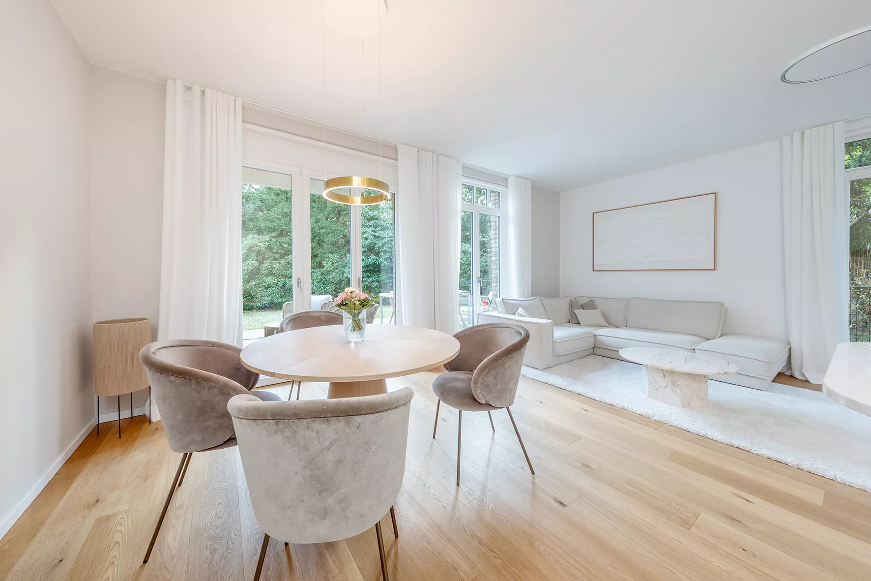 Offener Wohn-, Ess- und Kochbereich | Moderne Bäder mit großformatigen Fliesen | Schlafzimmer mit Bad en suite | Deckenspots | Eichenparkett in Dielenverlegung | Fußbodenheizung | Videogegensprechanlage | Südterrasse