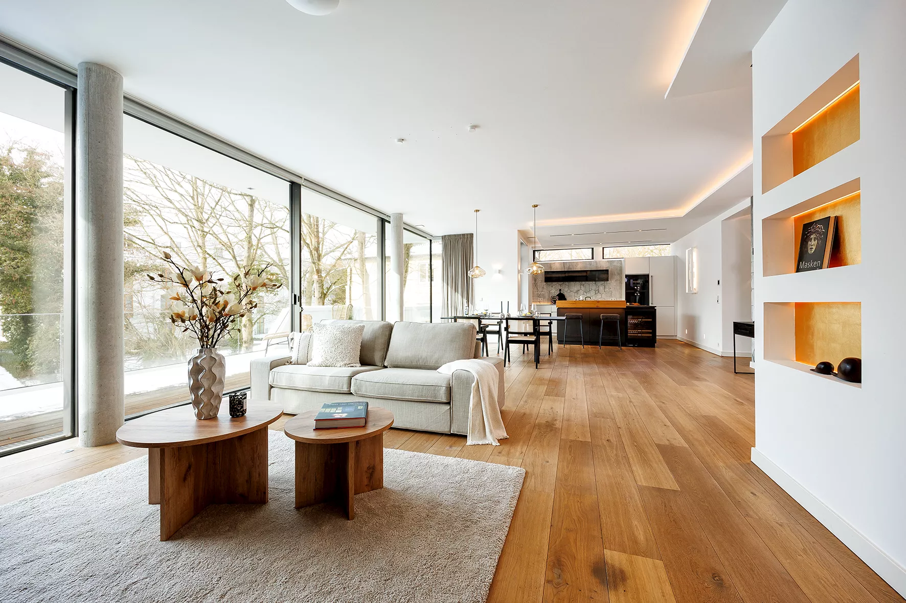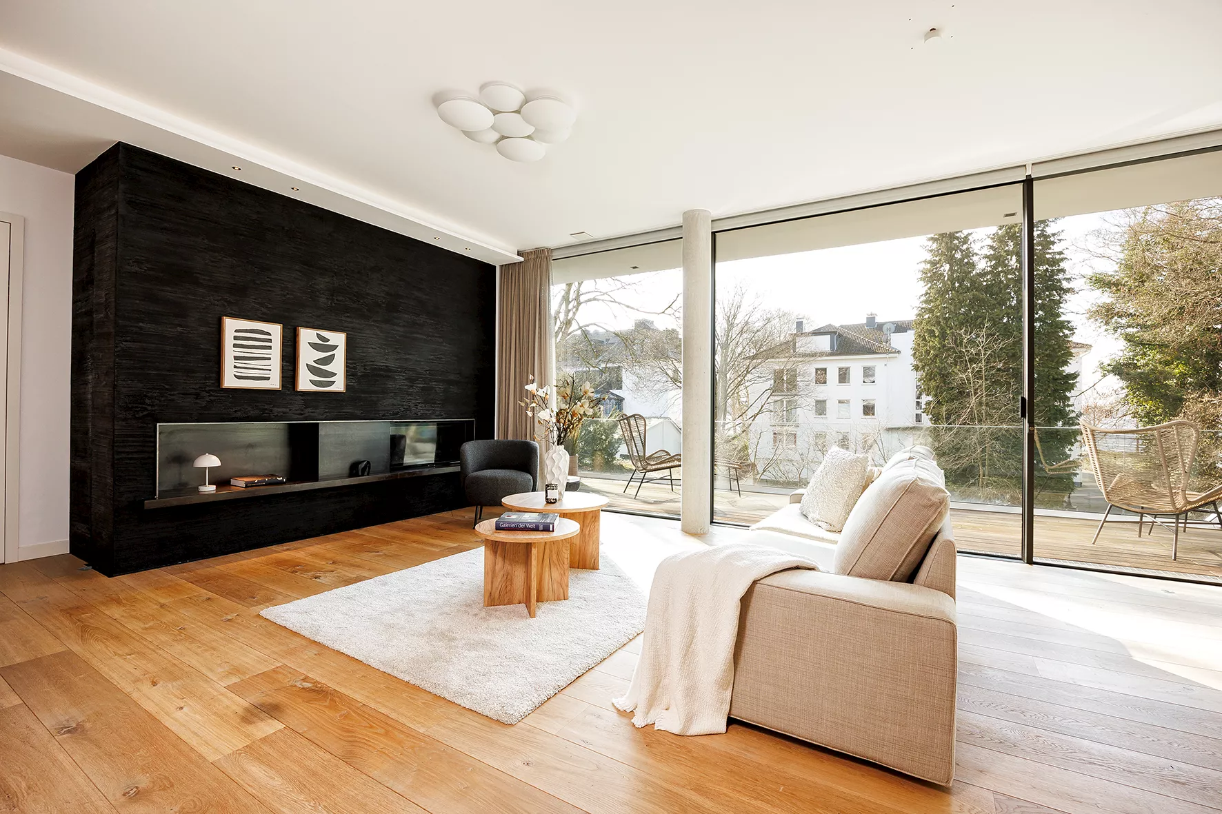 Offener, großzügiger Wohn- und Essbereich | Deckenhohe Sky-Frame Fenster | Eichendielen | Kamin | Sound- und Smart-Home-System | integriertes Lichtdesign | Aufzug führt direkt in die Wohnung | drei Balkone