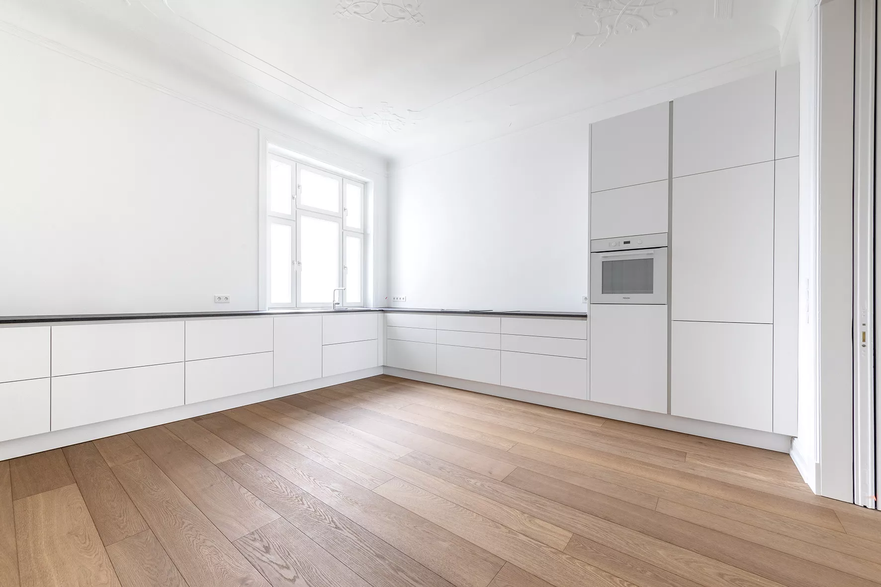 Ineinander übergehender Wohn- und Essbereich mit hohen Decken und aufgearbeitetem Stuck | Neuwertige Küche mit hochwertigen Einbauten namhafter Hersteller | Zwei moderne Bäder | Zwei Balkone | In der gesamten Wohnung: geputzte Wände, kassettierte Holztüren, Hamburger Fußleisten, Dielenboden