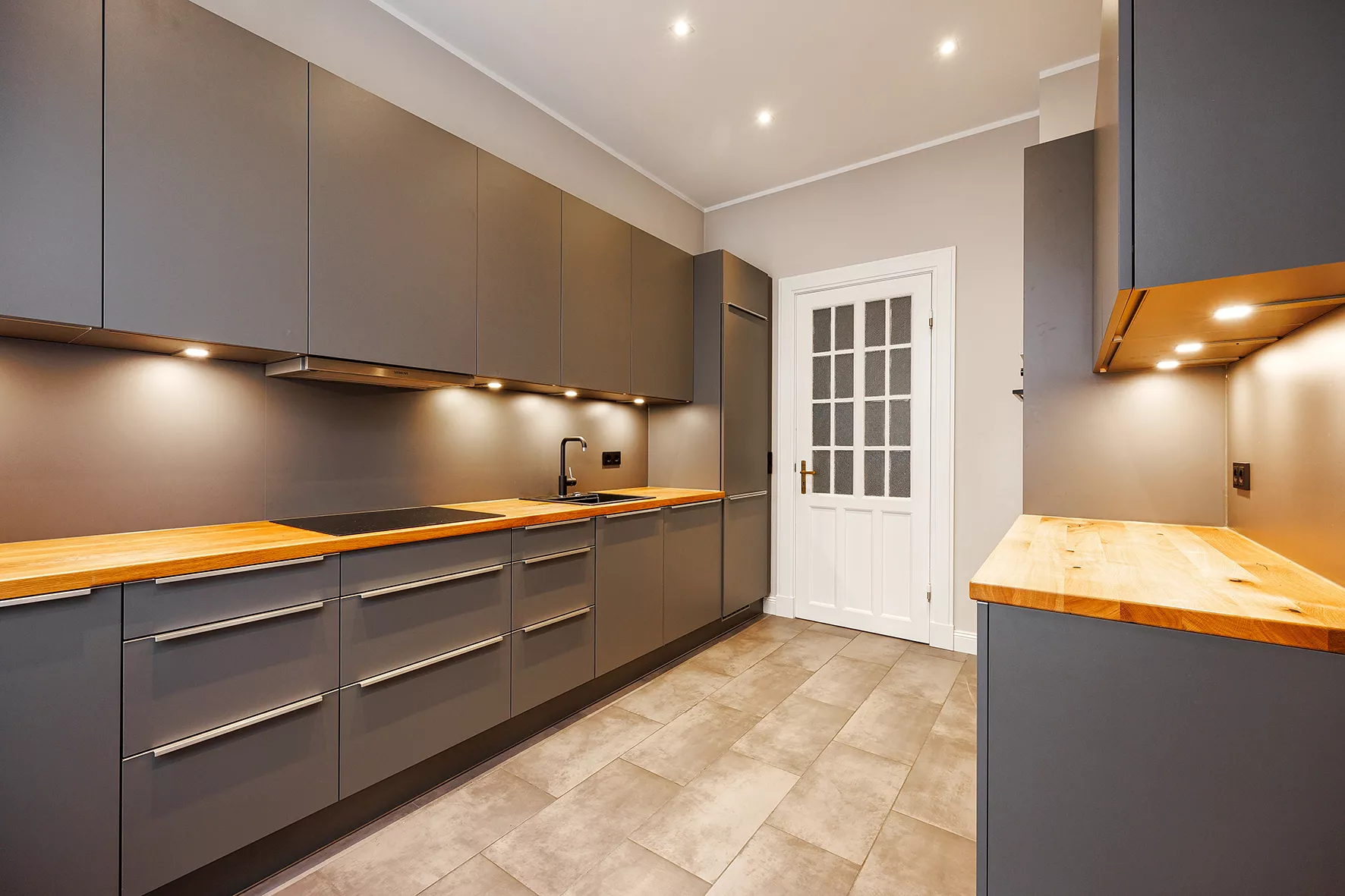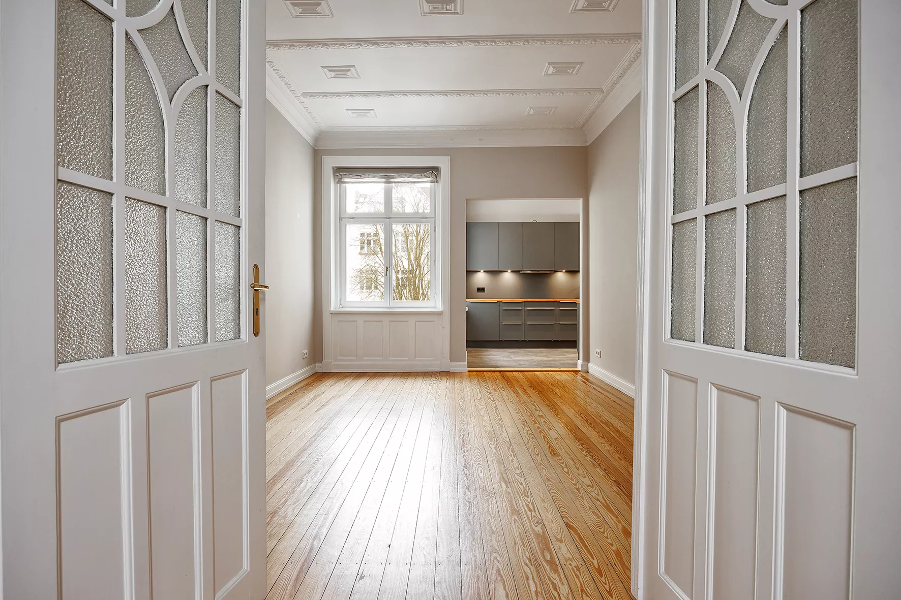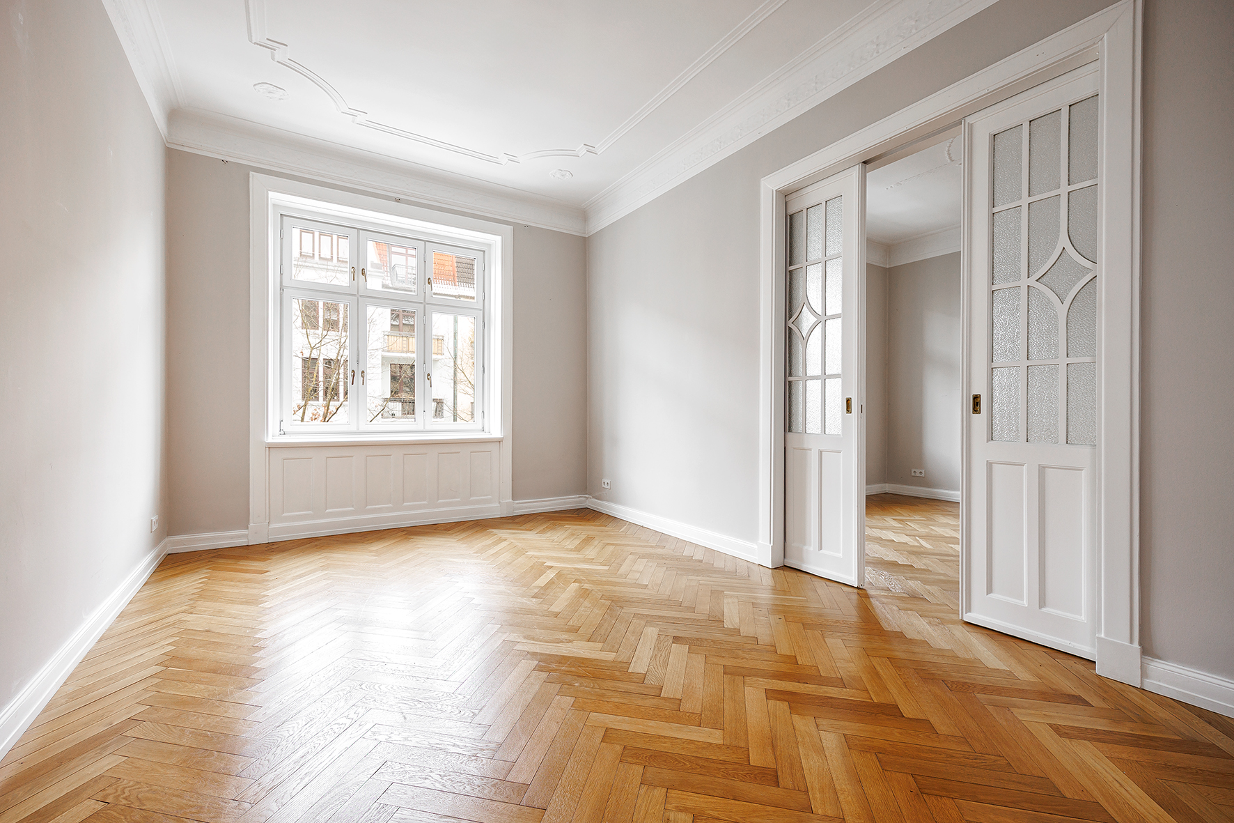 Eingangsbereich mit Garderobe | offener Wohn- und Essbereich, durch eine Schiebetür miteinander verbunden | Küche mit grauen Fronten, Holzarbeitsplatte und technische Geräte der Marke Siemens | zwei moderne Bäder mit großformatigen grauen Fliesen und anthrazitfarbenen Armaturen - eines davon als Vollbad | hohe Decken mit Stuckverzierungen | Parkett in Fischgrät- und Dielenverlegung | zwei Balkone
