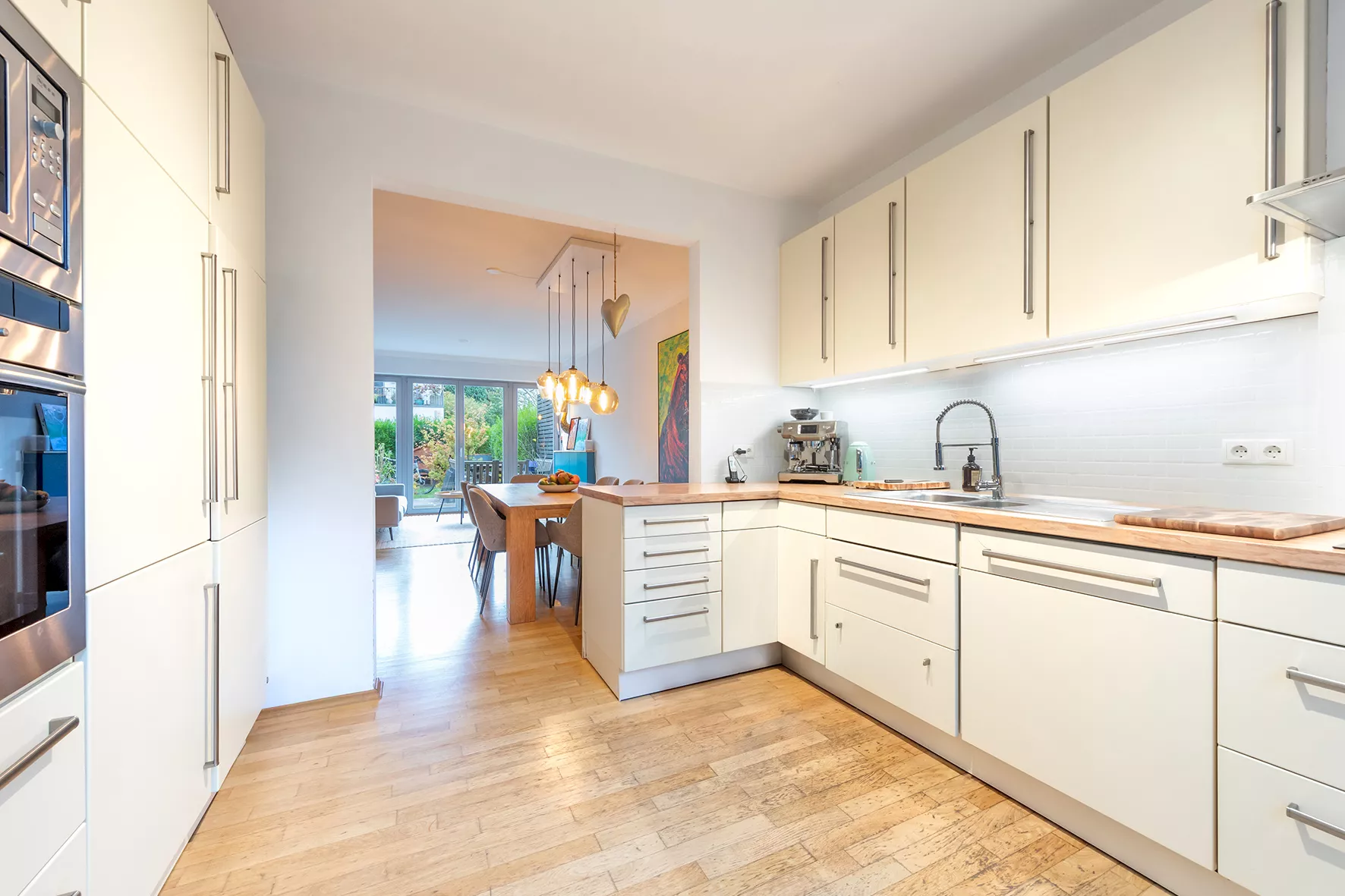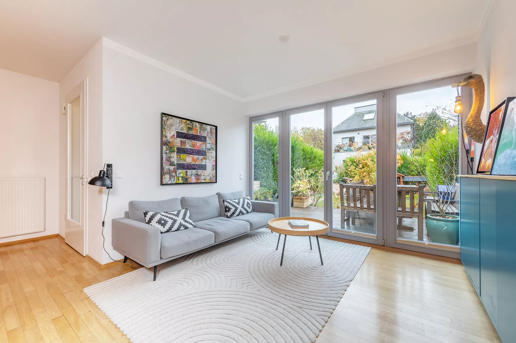 Hohe Decken sowie bodentiefe Fenster | Eichenparkett | Offener Wohn- und Essbereich | Küche mit Schiebetür und technischen Geräten sowie Zugang zu einer der beiden Terrassen | Südterrasse und Garten | Südbalkon