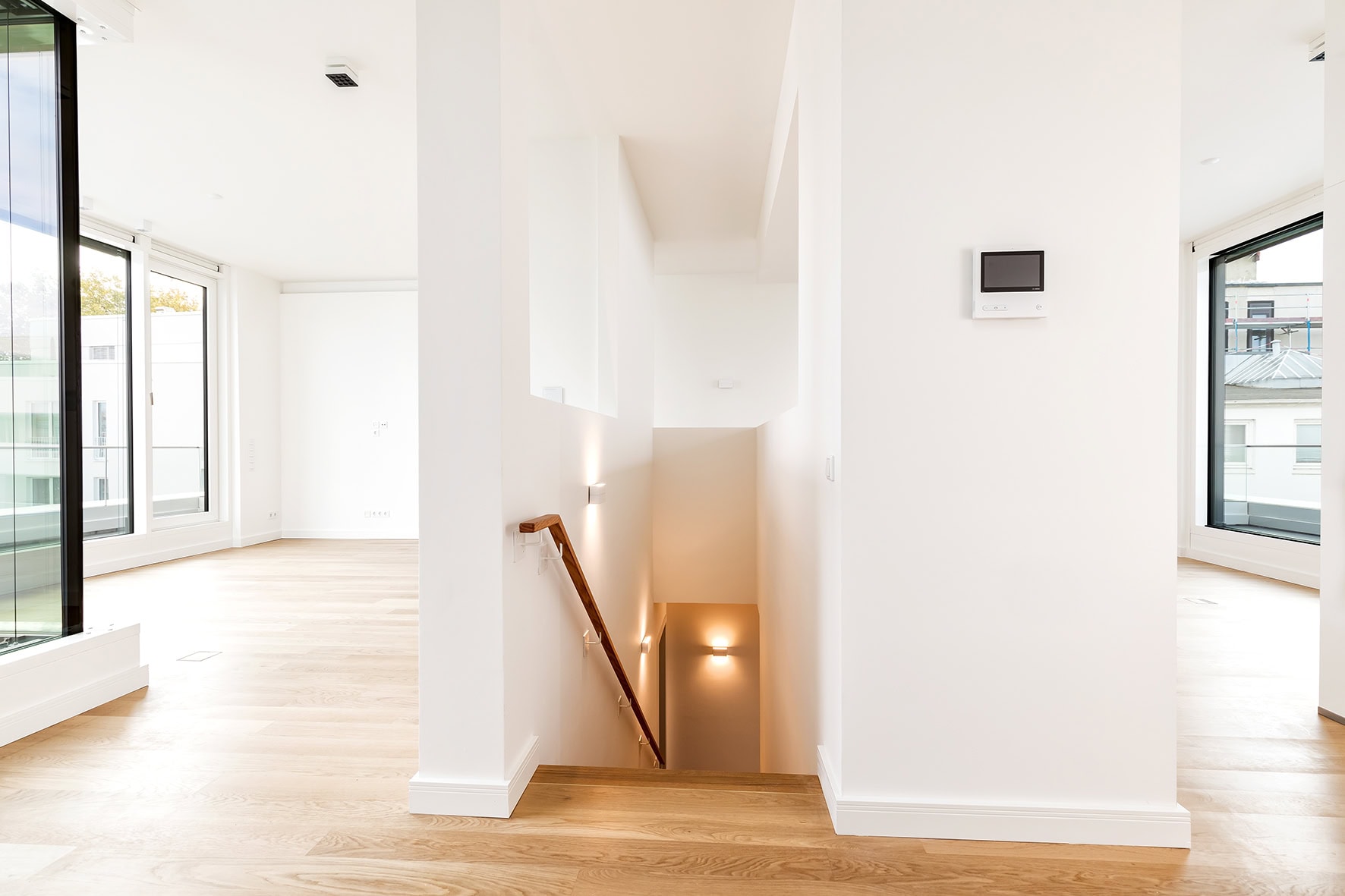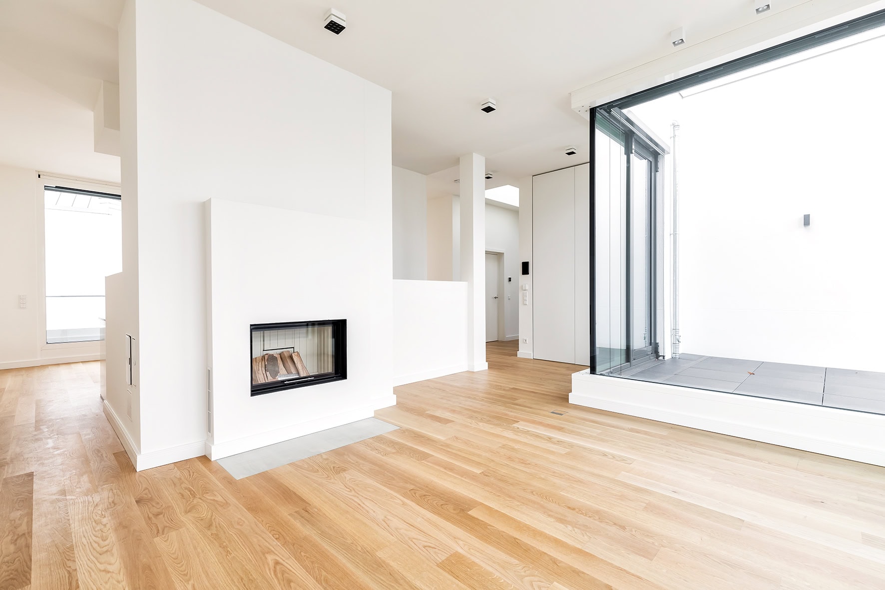 Großzügiger Wohn-, Ess- und Kochbereich mit Kamin | Küche mit weißen Einbauten und technischen Geräten der Marke Miele | Modernes Voll- und Duschbad: Dornbracht Armaturen und Spiegelheizung | Helles Eichenparkett | Eine Dachterrasse und ein Balkon kommen hinzu | Lebensqualität per Swipe - Beleuchtung, Raumtemperatur und Lüftung über Apps steuerbar