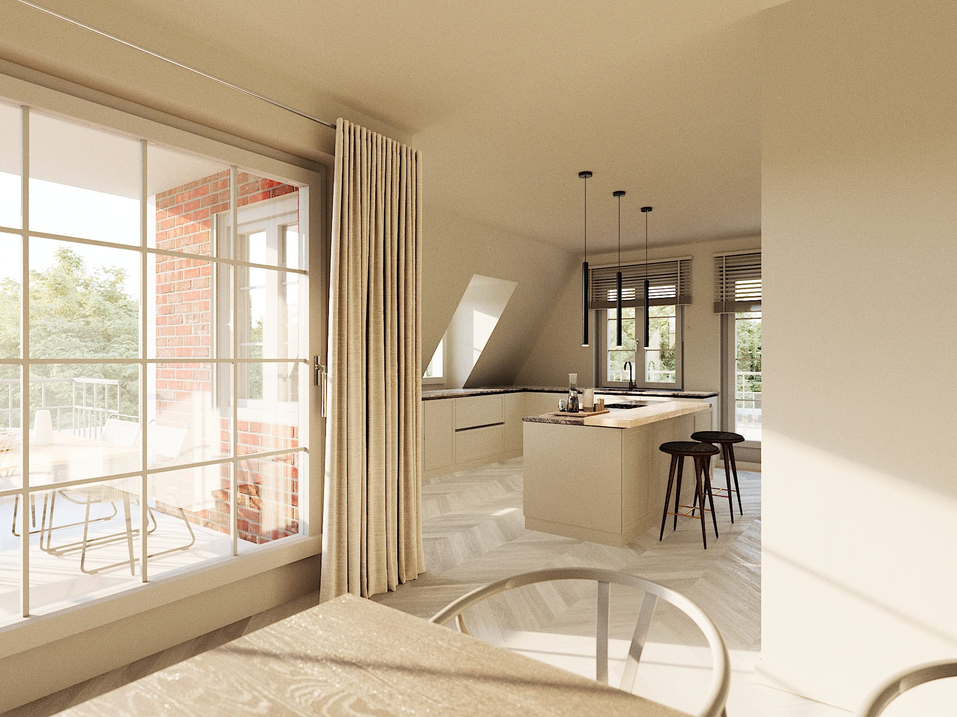 Hochwertig bis ins kleinste Detail: Wände mit Malerflies, gebürstete und geölte Eichendielen sowie Feinsteinzeug, Decken- und Wandspots, Fenster in Teilen mit Raffstores und Rollläden, Smart-Home-System und Schalter der Marke GIRA, exklusive Einbauküchen mit Mittelkochblöcken und Naturstein-Arbeitsplatten, hochwertige Badobjekte samt Armaturen des namhaften Herstellers Dornbracht, Loggien und Terrassen.