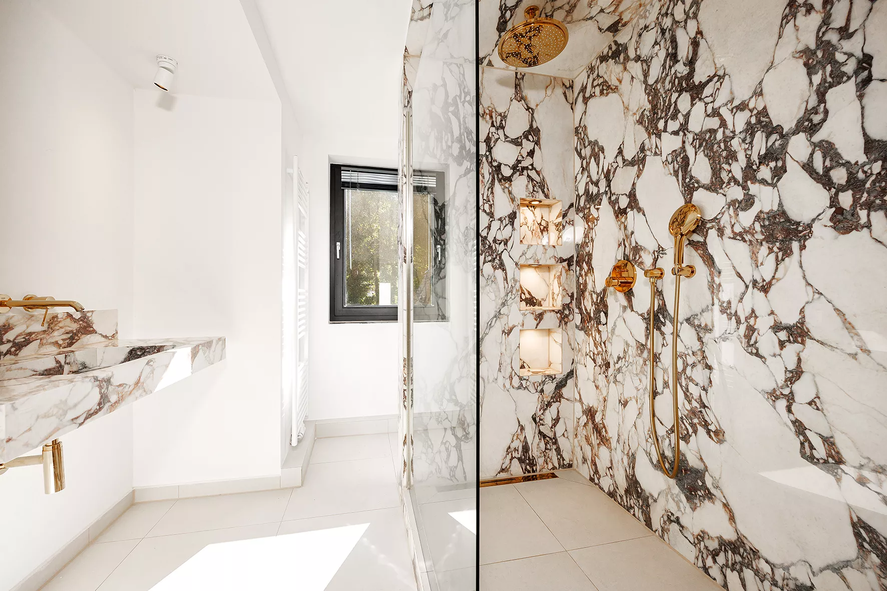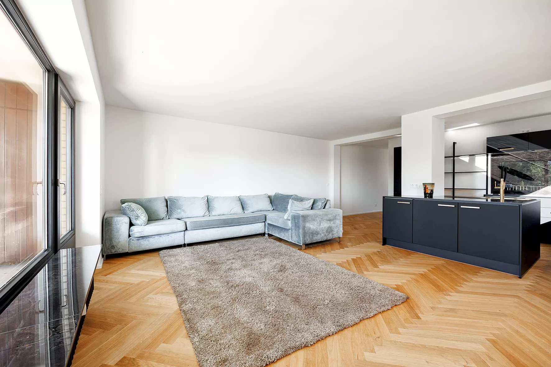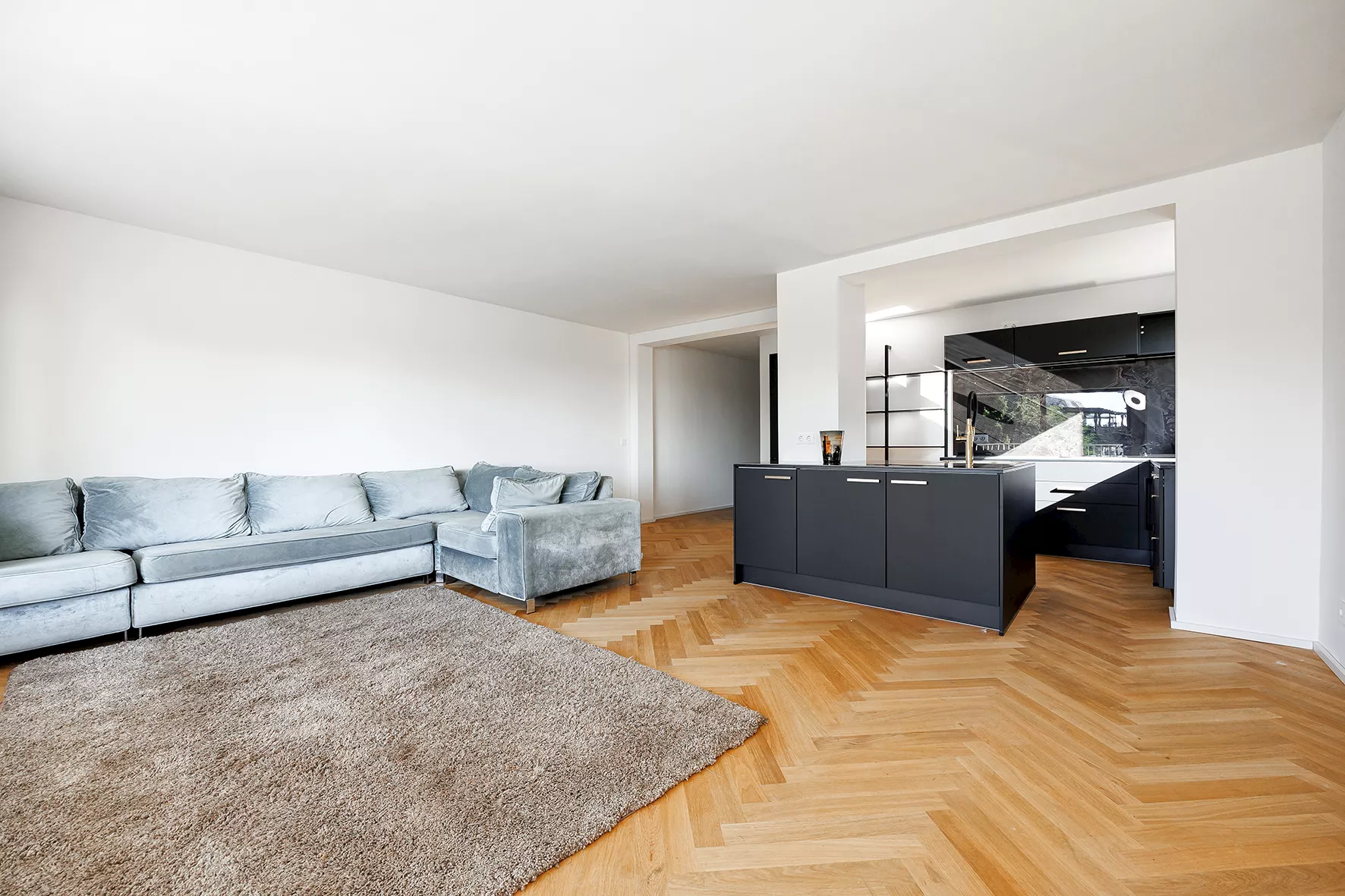 Offen gestalteter Wohn-, Ess- und Kochbereich | Küche mit Einbauten von Nobilia und technischen Geräten des Herstellers Bosch | Duschbad und Gäste-WC mit individuellem Design in Marmor-Optik sowie Armaturen von Grohe | Großzügiger Balkon mit Abseite und Südausrichtung