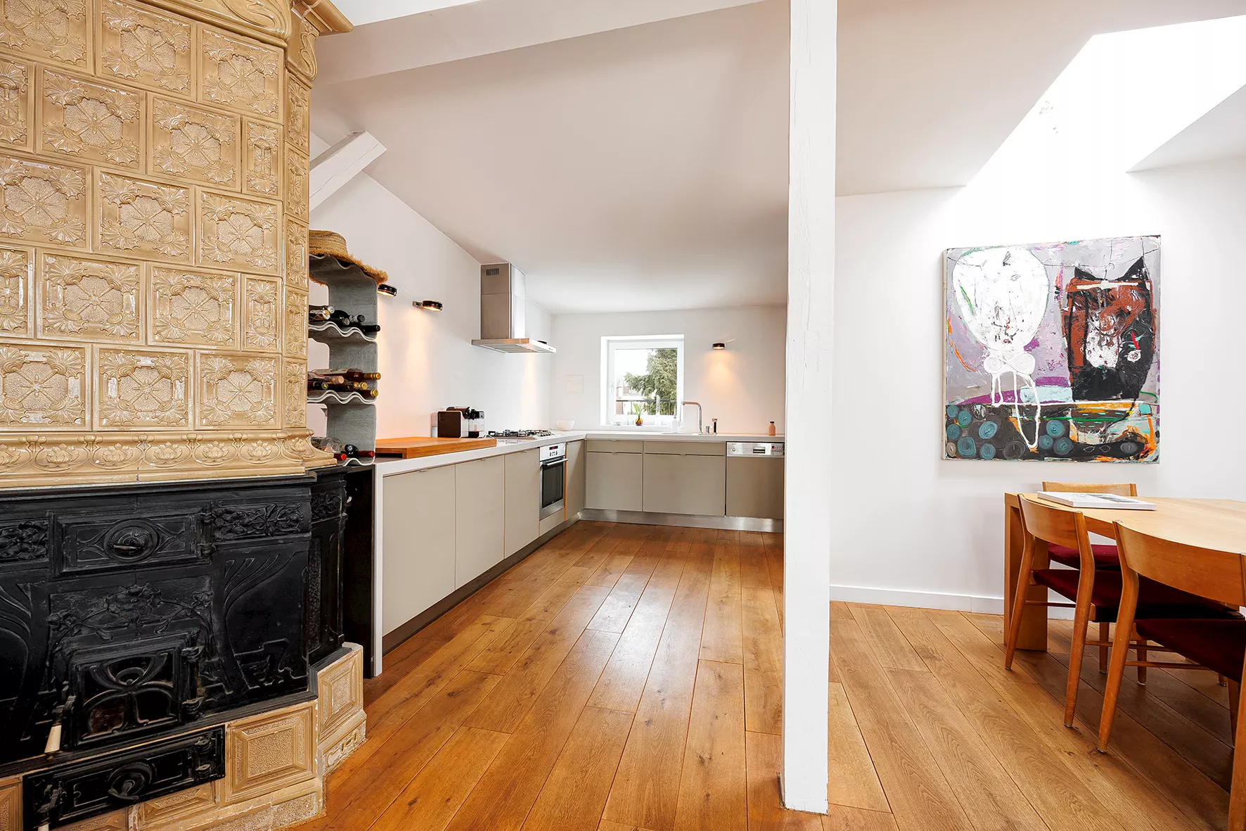offen gestalteter Wohn-, Ess- und Kochbereich | Eichenparkett | Sichtbalken | original erhaltener Kachelofen | Oberlicht im Essbereich | zwei Duschbäder | Schlafbereich mit offen gestalteter Ankleide Geöltes Eichenparkett in der gesamten Wohnung.