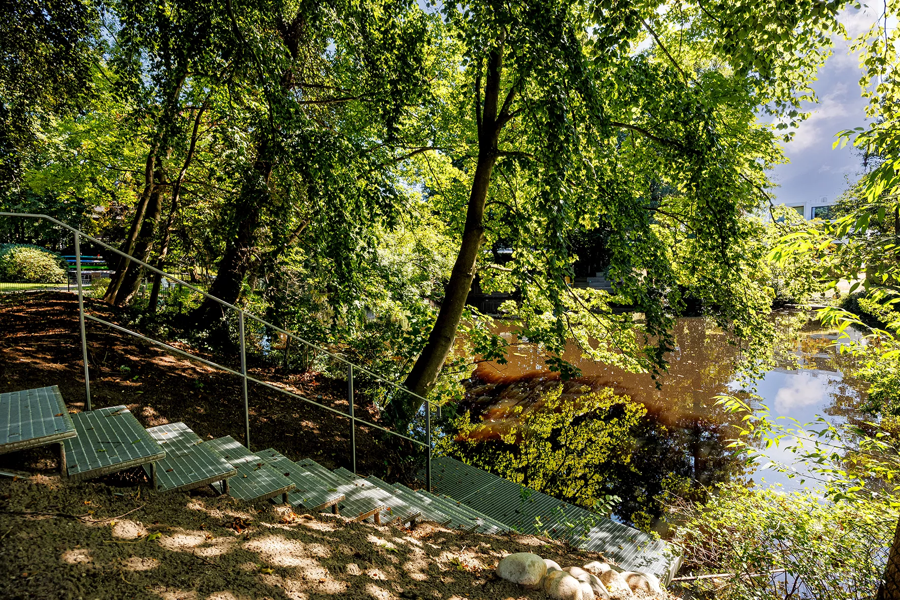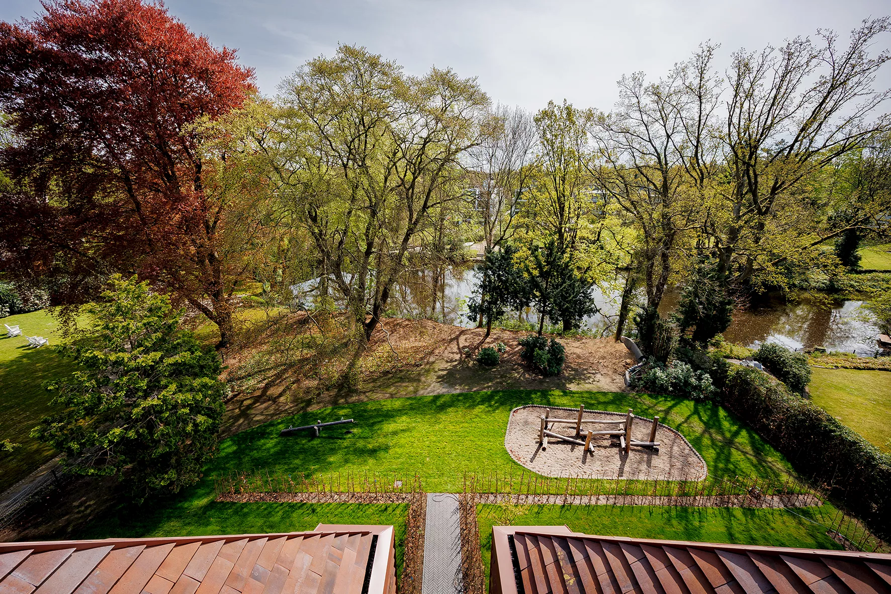 Der erstklassige Neubau fügt sich perfekt in die Umgebung ein - eine grüne Idylle angelegt mit altem Baumbestand und Wasserzugang.
