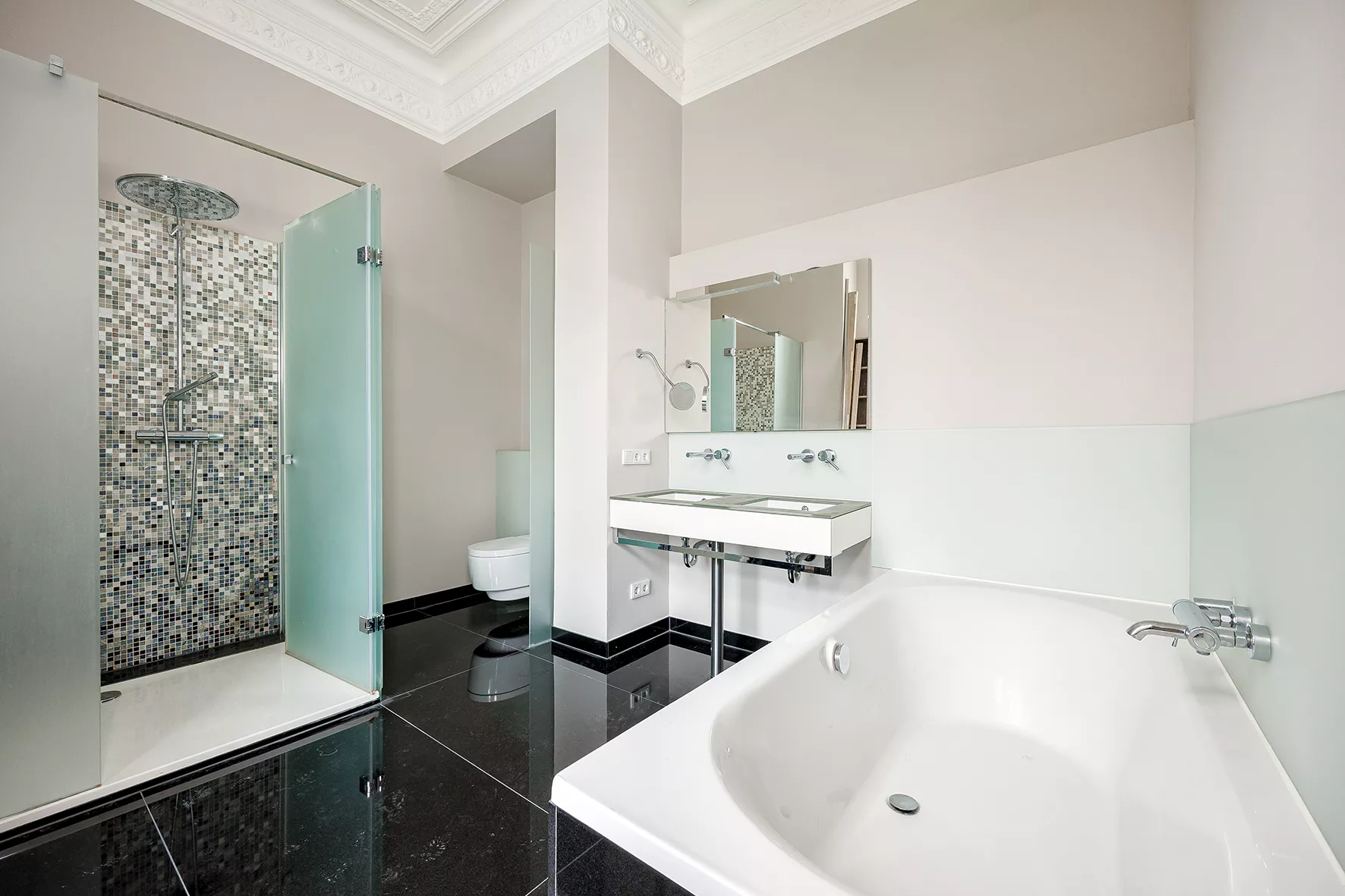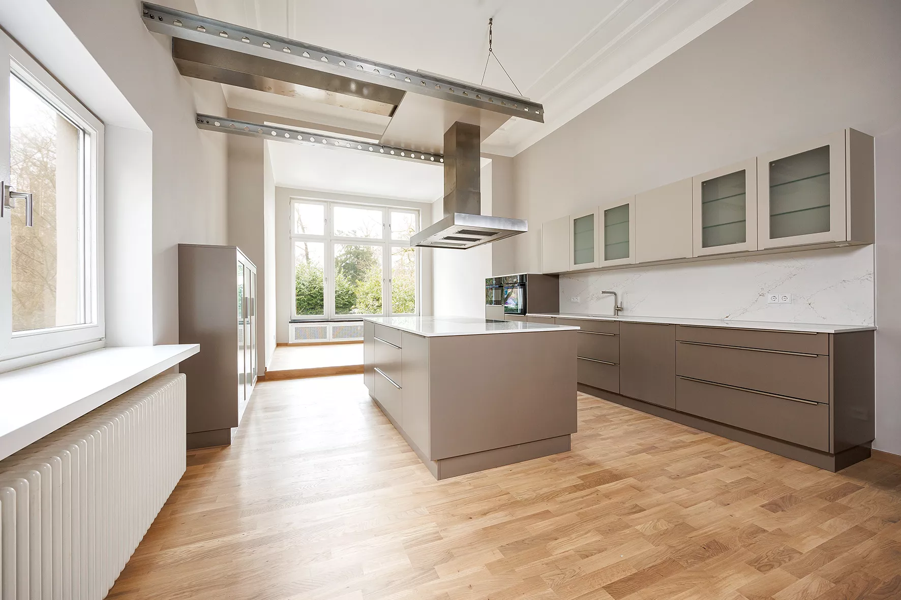 Hohe Decken | Imposante Stuckelemente | Parkettfußböden und kassettierte Holztüren mit Messing-Beschlägen | Ineinander übergehender Wohn-, Ess- und Kochbereich mit angrenzendem Wintergarten | Großzügige Wohnküche wird mit neuen Einbauten und technischen Geräten ausgestattet | Das Souterrain ist wohnlich ausgebaut und bietet vielfältige Nutzungsmöglichkeiten.