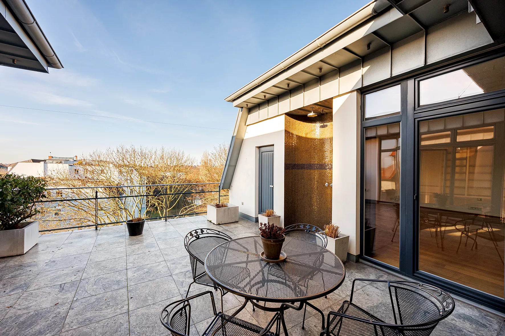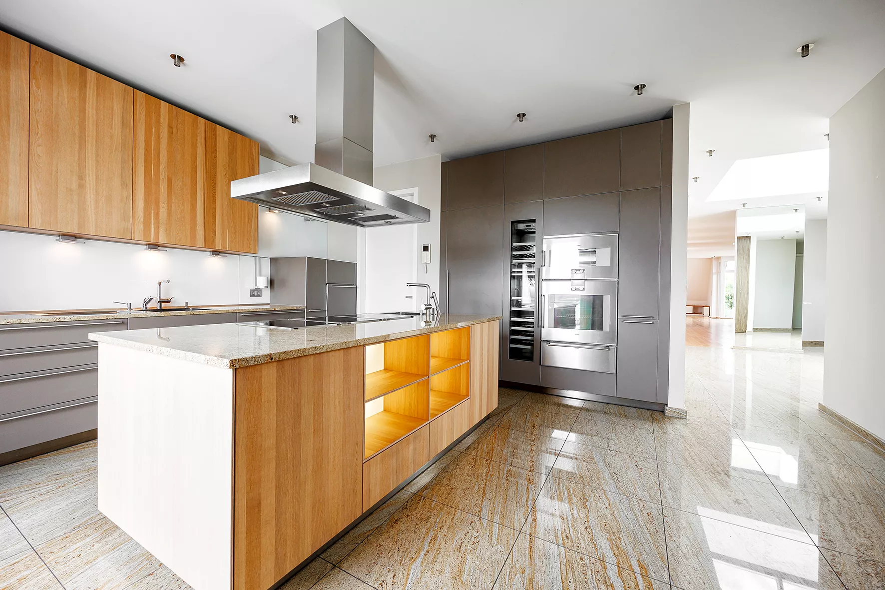 Hohe Decken mit Deckenspots | Kochbereich mit Bulthaup Küche und Balkon mit weitem Blick über Hamburg und die Alster | Großzügiger Wohn- und Essbereich mit klimatisiertem, verglastem Weinraum | Kamin | Dachterrasse nach Süden ausgerichtet mit Blick auf den Isebekkanal und einer Runddusche in Glasmosaik