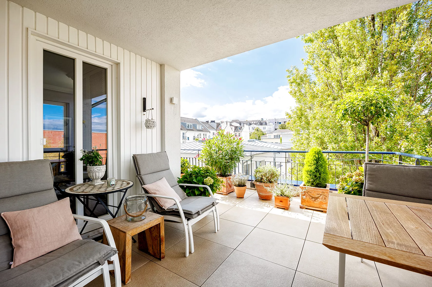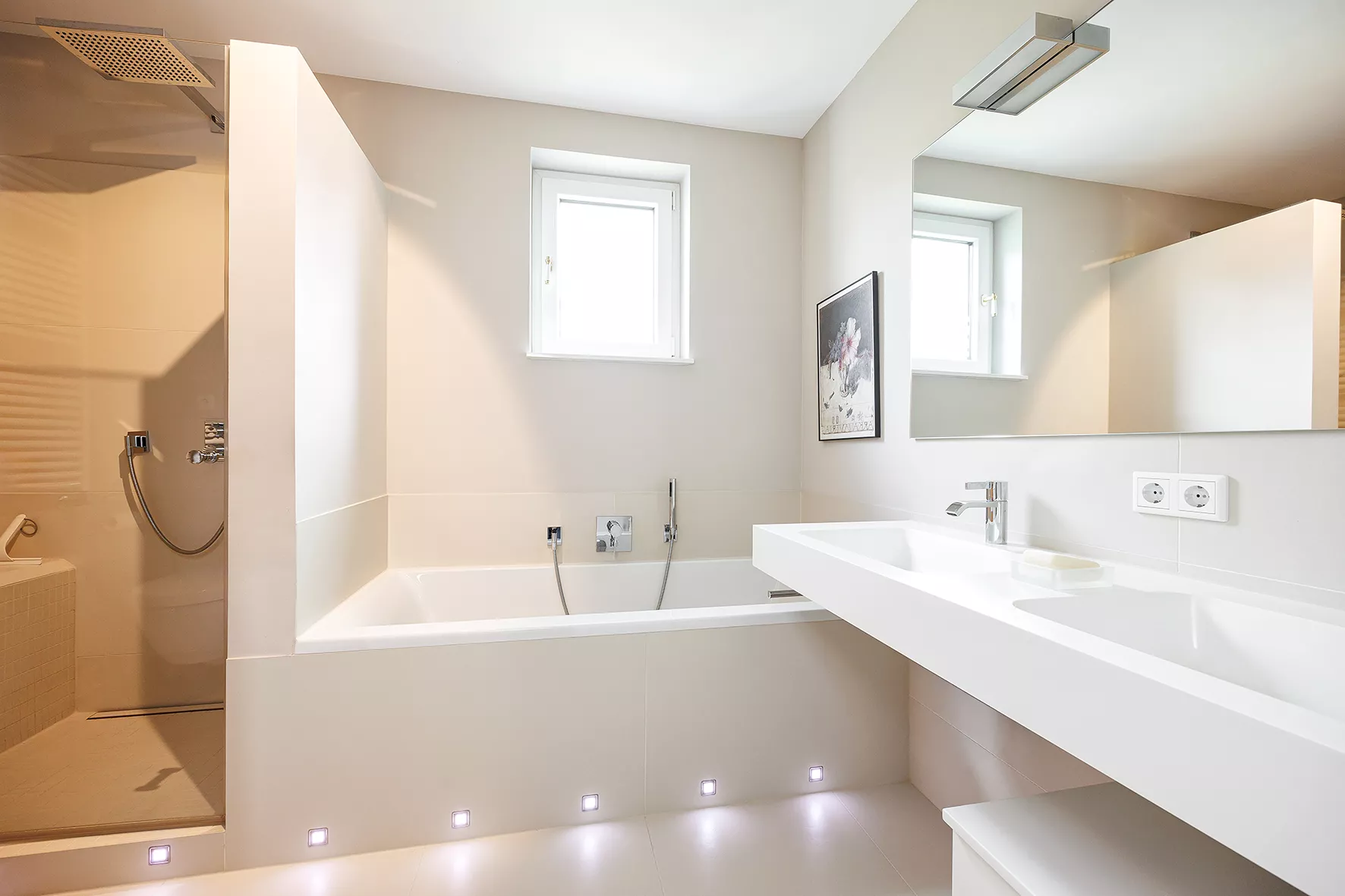 | Eichenparkett | Moderne Bäder mit großformatigen Fliesen und hochwertigen Armaturen | Umlaufender Balkon mit Weitblick