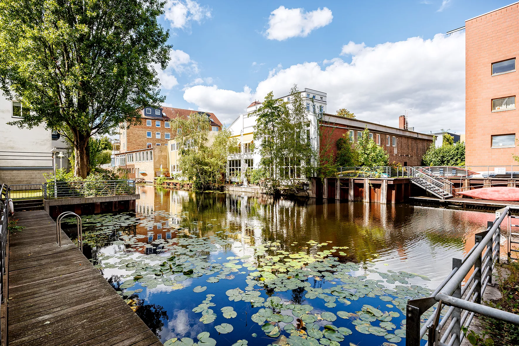 Die Eigentumswohnung besticht mit ihrer ruhigen Lage und Blick auf den Uhlenhorster Kanal. Das Highlight ist der private Wasserzugang über den hauseigenen Bootssteg.